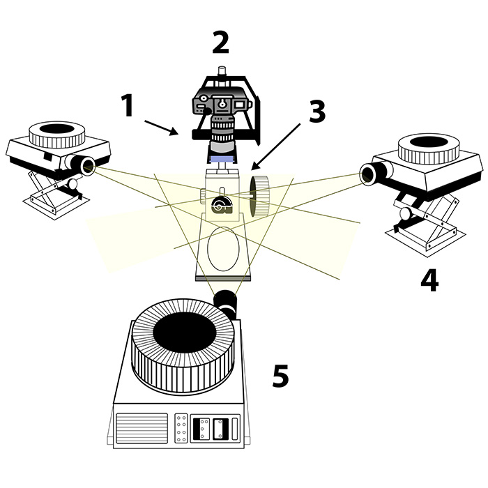 Equipment required to make SLP images is no longer commercially available. For those still wanting to try SLP, a working system can be built for approximately 50-100 dollars depending on how much equipment can be borrowed, rented or scavenged. The setup used to make the accompanying images consists of three standard Kodak EktagraphicTM AF-2 projectors using ELH lamps and fitted with 102-152mm zoom lenses. The projectors were positioned at a distance sufficient to project as thin a focused plane of light on the sample as possible, about 24 inches from lens to subject. To create the thin plane of light, plastic slide mounts were used to hold pieces of double edged razor blades, edge to edge, across the center of the slide mount aperture. The area above and below the metal of the blade was masked with at least two layers of metallized tape to limit the spill of light (Root, 1986). To adjust the height and level of the projectors we initially used books and cardboard shims. This is not a practical approach if you plan on doing SLP on a routine basis, but a good way to run film exposure tests to see if the rest of your setup works. Later, the purchase of equipment jacks from VWR scientific supply house provided quick and easy adjustments for height, pitch and roll [figure 2].