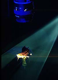 Equipment required to make SLP images is no longer commercially available. For those still wanting to try SLP, a working system can be built for approximately 50-100 dollars depending on how much equipment can be borrowed, rented or scavenged. The setup used to make the accompanying images consists of three standard Kodak EktagraphicTM AF-2 projectors using ELH lamps and fitted with 102-152mm zoom lenses. The projectors were positioned at a distance sufficient to project as thin a focused plane of light on the sample as possible, about 24 inches from lens to subject. To create the thin plane of light, plastic slide mounts were used to hold pieces of double edged razor blades, edge to edge, across the center of the slide mount aperture. The area above and below the metal of the blade was masked with at least two layers of metallized tape to limit the spill of light (Root, 1986). To adjust the height and level of the projectors we initially used books and cardboard shims. This is not a practical approach if you plan on doing SLP on a routine basis, but a good way to run film exposure tests to see if the rest of your setup works. Later, the purchase of equipment jacks from VWR scientific supply house provided quick and easy adjustments for height, pitch and roll [figure 2].